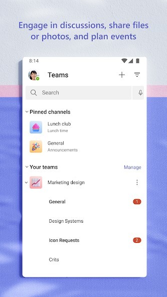 • Work closely and collaborate by keeping conversations organized by specific topics and projects with teams and channels.