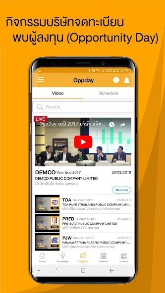 3. Oppday: รับชมกิจกรรมบริษัทจดทะเบียนพบผู้ลงทุน (Opportunity Day) ได้ทั้งแบบถ่ายทอดสดและย้อนหลัง รวมถึงสามารถดูตารางการจัดกิจกรรมล่วงหน้าเพื่อลงทะเบียนเข้าร่วมกิจกรรม