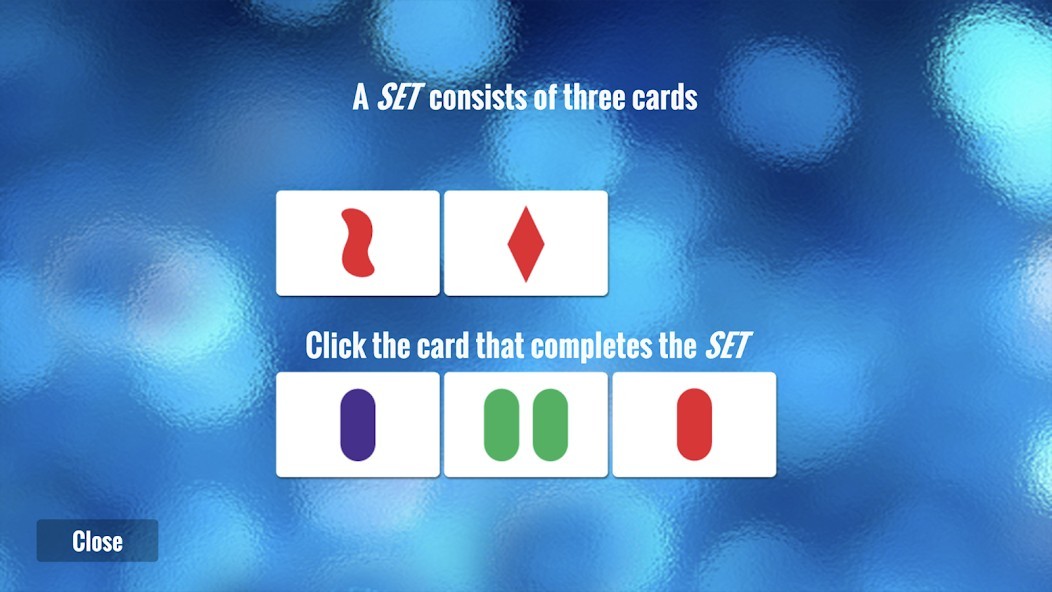 Challenge yourself with six addictive game play options: Classic, Puzzle, Sprint, Marathon, Arcade and Rediscovery.SET Mania includes an interactive tutorial that makes it easy to learn. The goal is to find all the SETs as quickly as possible. A SET is 3 cards in which each individual feature (color, shape, number and shading) is either all the SAME…or all DIFFERENT on each card.