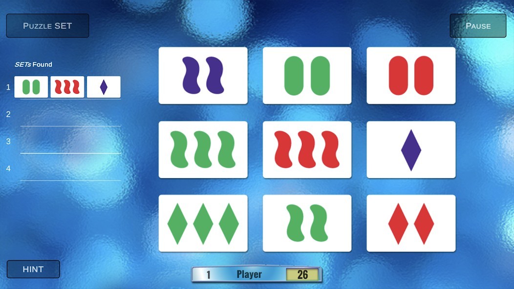 · SET Puzzle challenges you to find either 4 SETs in 9 cards (Basic Deck) or 6 SETs in 12 cards (Advanced Deck) in the least amount of time.