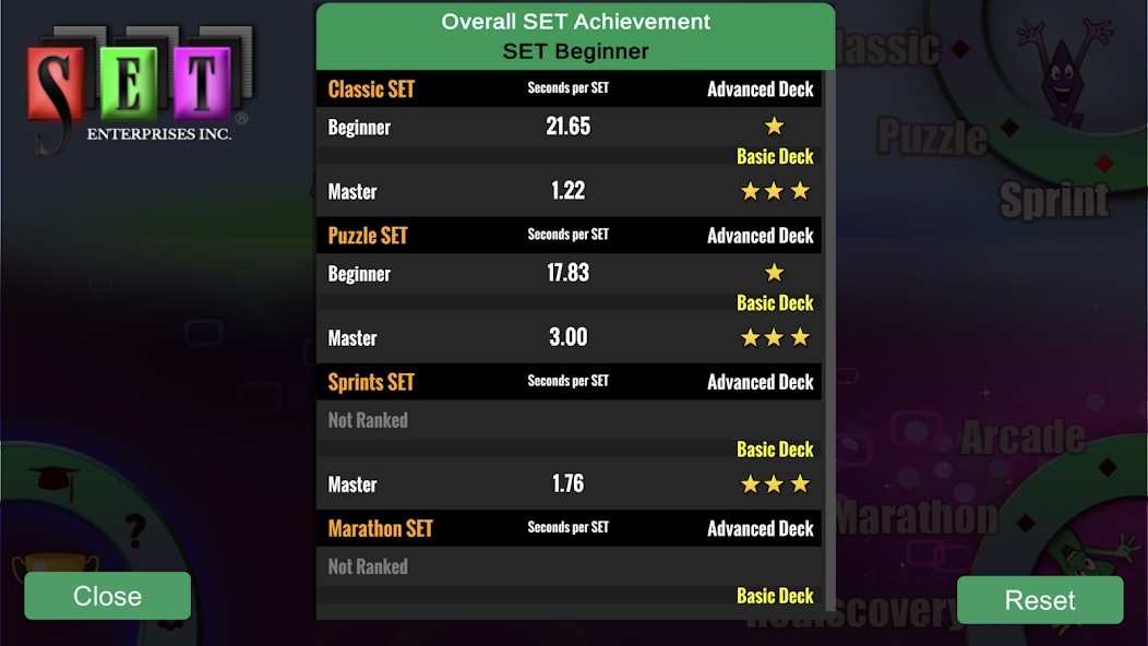 Achieve the highest ranking of SET Master by getting 3 Stars in BOTH Basic and Advanced decks in ALL six game plays: